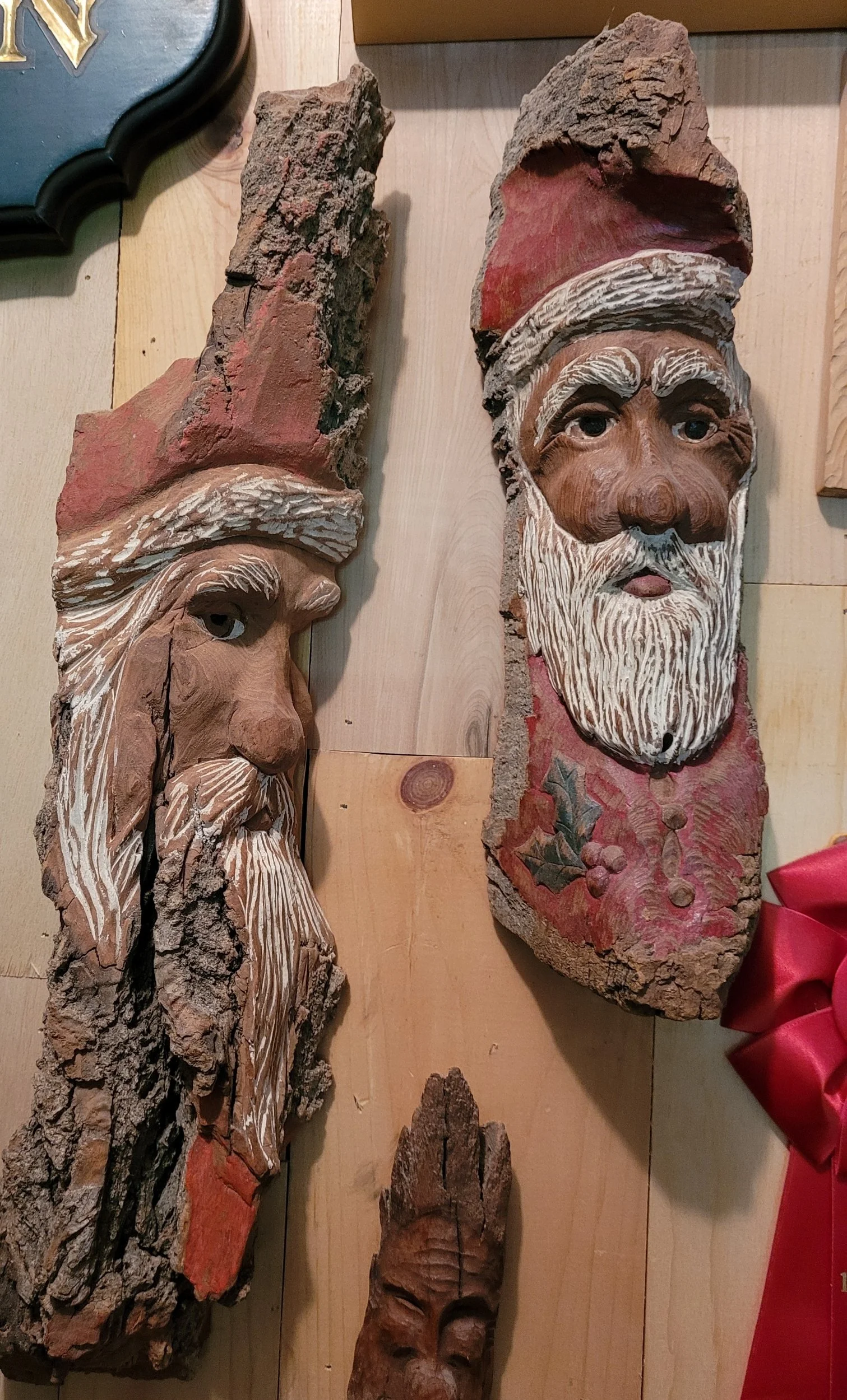wood spirit santa carvings, gnome house carving, bald eagle carvings